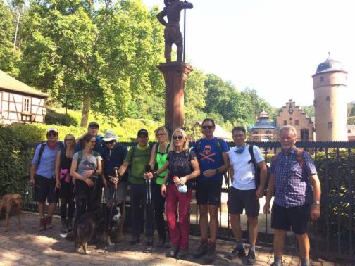 Die Hin- und Rückfahrt der 11 Teilnehmer mit 2 Hunden erfolgte mit dem PKW. Ausgangspunkt der zwei Rundwanderungen war Hobbach. Die Tour startete bei herrlichem Wetter und führte uns nach Heimathen zum ersten Einkehrschwung. Auf sehr gutem Wanderweg erreichten wir die Waldgaststätte „Hohe Wart“ zur Mittagsrast. Nächster Anlaufpunkt war Mespelbrunn mit dem bekannten Wasserschloß. Die Anlage ist seit dem 15. Jahrhundert im Besitz der Familie Echter von Mespelbrunn.