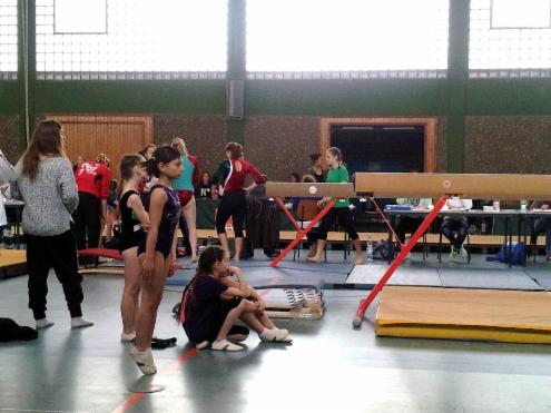 Es ging also schon morgens um acht Uhr los mit dem ersten Durchgang, gefolgt von weiteren drei Durchgängen. Die Zuschauer konnten die Wettkämpfe mit gutem Blick von der Bühne oder vom Hallenrand verfolgen. Auch für die Turnerinnen war genügend Platz in der Halle, so dass der Wettkampf problemlos verlaufen konnte und wir sogar vor dem Zeitplan die Siegerinnen des letzten Durchgangs ehren konnten.