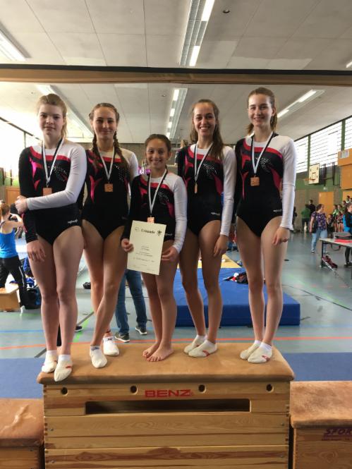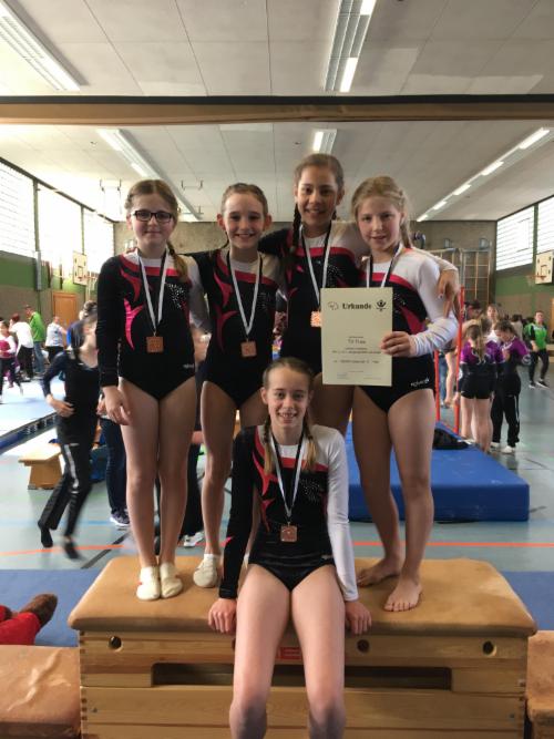 Ebenfalls am Morgen startete im Wettkampf 10 (LK 4) Jahrgangsoffen Alina Moldt, Alena Krug, Alicia Alves, Jolina Hohmann und Karolina Schafft. Auch diese Mannschaft hatte die meisten Probleme am Schwebebalken. Außer Alicia Alves mussten leider alle Mädchen einmal vom Balken absteigen. Der Sprung war wieder ein starkes Gerät. Alina Moldt zeigte mit 12,30 Punkten den besten Sprung. Am Boden und Barren turnten alle Mädchen sehr gute Übungen und konnten dabei viele Punkte sammeln. Mit einer Gesamtpunktzahl von 123,05 Punkten belegten sie schließlich auch einen hervorragenden 3. Platz.