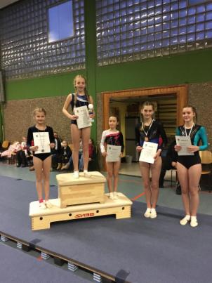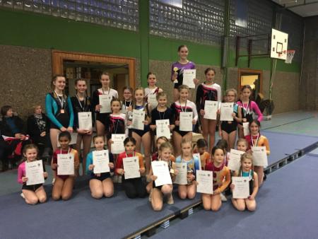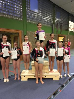 Der erste Platz ging an Mara Keller mit 47,8 Punkten dicht gefolgt von Alicia Alves mit 46,7 Punkten auf Platz 2. Der dritte Platz ging an Jana Laubach mit 43,9 Punkten. Es folgten Sarah Käs mit 43,7 Punkten, Katharina Lapp mit 42 Punkten, Annabelle Mank mit 41,2 Punkten und Scara Amberege mit 40,7 Punkten. Mehry Engert turnte nur am Balken mit einer Punktzahl von 11,1 Punkten.